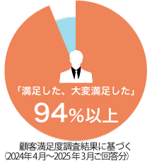 2024年度に不動産売買のご成約をいただきましたお客さまの取引件数は、9,000件超。弊社に対する満足度調査(5段階評価)では、94%以上のご成約者さまより「大変満足した」「満足した」との回答をいただいております。(無回答0.8%を除く)