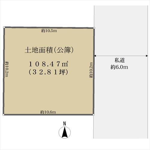 一方 東約6.0m私道、間口:約10.2m |