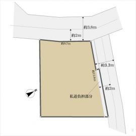 二方 北西約3.8m公道、間口:約9.7m 北東約3.3m公道、間口:約12.8m |