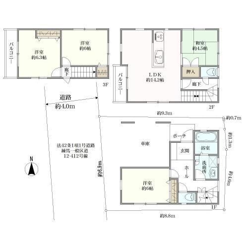 土地面積 59.60m2(18.0坪) 登記簿 建物延面積 103.00m2 車庫部分6.48m2含む