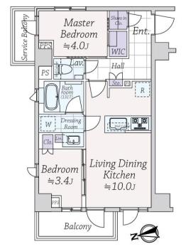 間取り 2LDK 専有面積 43.68m2(13.2坪) 壁芯