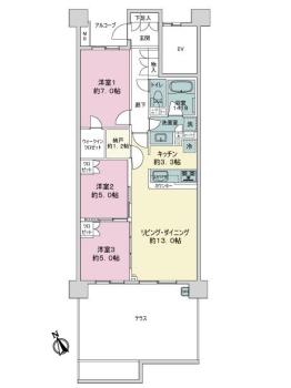 間取り 3LDK 専有面積 77.12m2(23.3坪) 壁芯