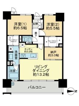 間取り 2LDK 専有面積 74.37m2(22.4坪) 壁芯