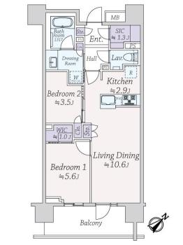 間取り 2LDK 専有面積 55.05m2(16.6坪) 壁芯