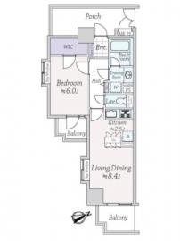 間取り 1LDK 専有面積 43.35m2(13.1坪) 壁芯