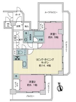 間取り 2LDK 専有面積 61.03m2(18.4坪) 壁芯