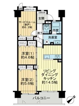 間取り 2SLDK 専有面積 70.36m2(21.2坪) 壁芯