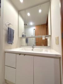 • 3面鏡が備わった洗面化粧台。ボウルとカウンターはお手入れのしやすい一体型です。