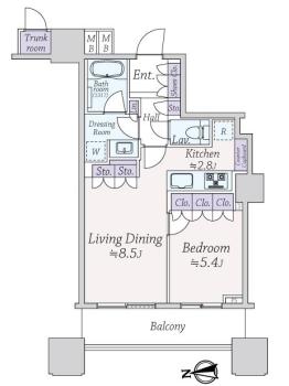 間取り 1LDK 専有面積 43.89m2(13.2坪) 壁芯