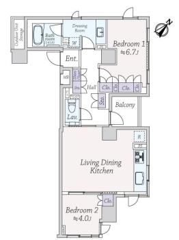 間取り 2LDK 専有面積 64.01m2(19.3坪) 壁芯