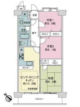 間取り 3LDK 専有面積 59.85m2(18.1坪) 壁芯