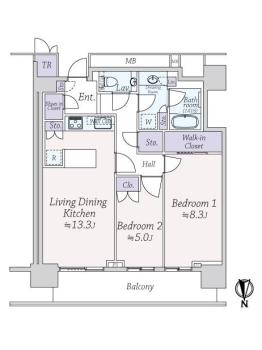 間取り 2LDK 専有面積 68.42m2(20.6坪) 壁芯