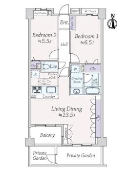 間取り 2LDK 専有面積 60.48m2(18.2坪) 壁芯