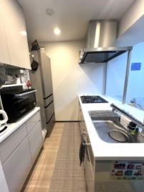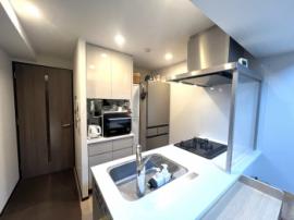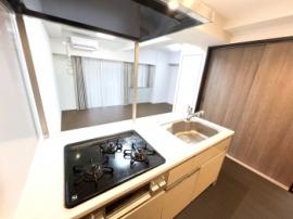 • ガラス仕切りの開放的なカウンターキッチン、備付の食器棚