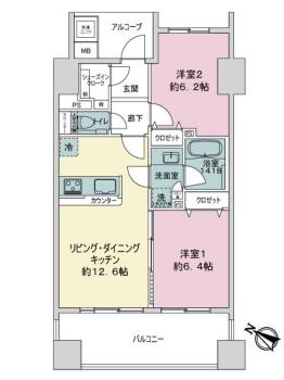 間取り 2LDK 専有面積 57.53m2(17.4坪) 壁芯