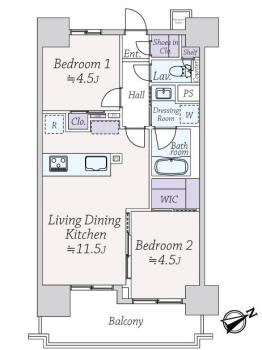 間取り 2LDK 専有面積 48.26m2(14.5坪) 壁芯