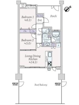 間取り 2LDK 専有面積 57.15m2(17.2坪) 壁芯