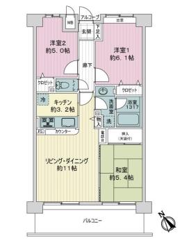 間取り 3LDK 専有面積 66.37m2(20.0坪) 壁芯
