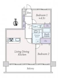 間取り 2LDK 専有面積 61.32m2(18.5坪) 壁芯
