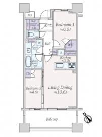 間取り 2LDK 専有面積 56.64m2(17.1坪) 壁芯