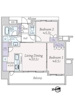 間取り 2LDK 専有面積 58.36m2(17.6坪) 壁芯
