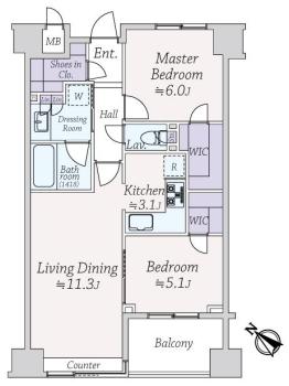 間取り 2LDK 専有面積 60.86m2(18.4坪) 壁芯