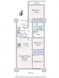 間取り 3LDK 専有面積 74.98m2(22.6坪) 壁芯