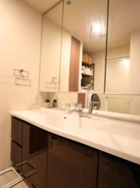 • ミラー裏にたっぷり収納スペースを確保したベーシックな三面鏡付洗面化粧台