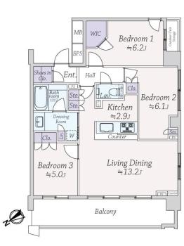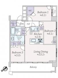 間取り 3LDK 専有面積 73.43m2(22.2坪) 壁芯
