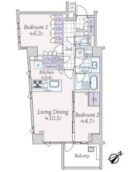 間取り 2LDK 専有面積 60.36m2(18.2坪) 壁芯