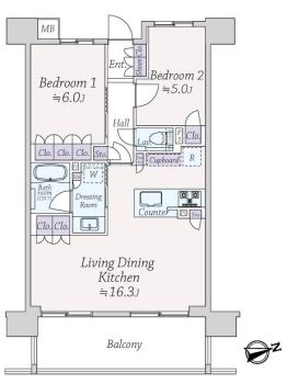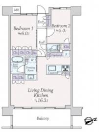 間取り 2LDK 専有面積 60.23m2(18.2坪) 壁芯
