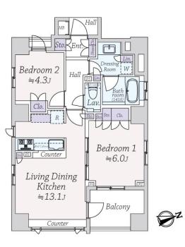 間取り 2LDK 専有面積 54.83m2(16.5坪) 壁芯
