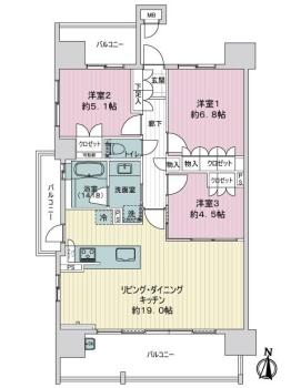 間取り 3LDK 専有面積 75.91m2(22.9坪) 壁芯