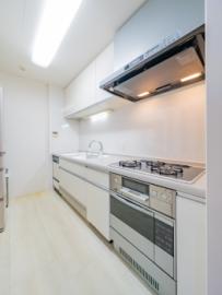 • ガスオーブンと造り付け食器棚を備えた機能的なシステムキッチン