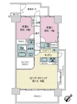 間取り 2LDK 専有面積 64.79m2(19.5坪) 壁芯