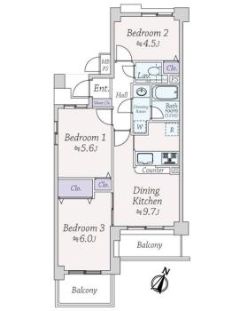 間取り 3DK 専有面積 56.64m2(17.1坪) 壁芯