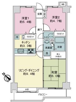 間取り 3LDK 専有面積 62.20m2(18.8坪) 壁芯