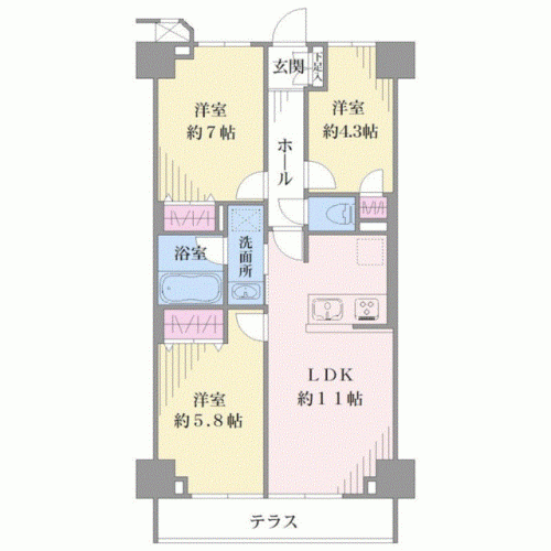 間取り 3LDK 専有面積 58.48m2(17.6坪) 壁芯