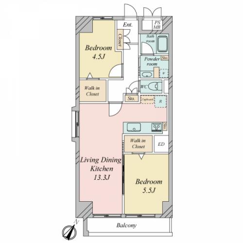 間取り 2LDK 専有面積 62.10m2(18.7坪) 壁芯