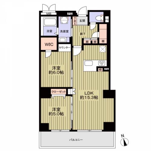 間取り 2LDK 専有面積 66.53m2(20.1坪) 壁芯