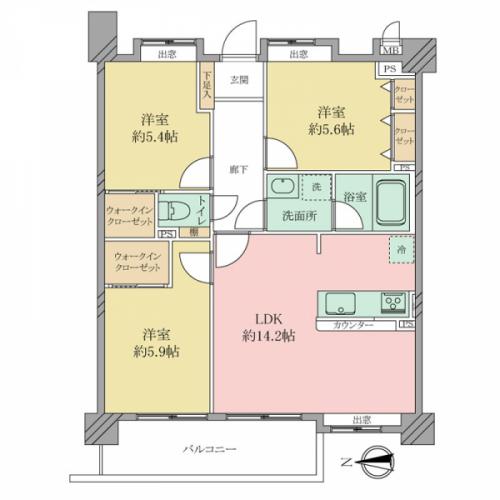 間取り 3LDK 専有面積 68.64m2(20.7坪) 壁芯