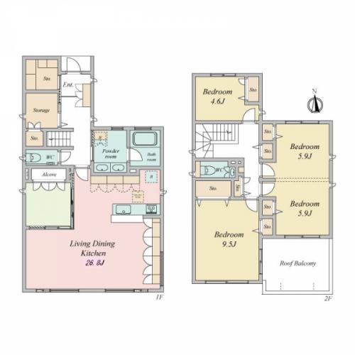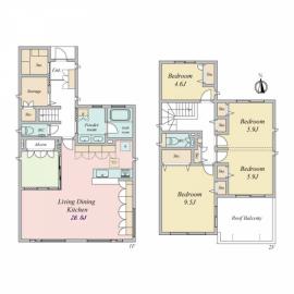 土地面積 159.11m2(48.1坪) 登記簿 別途私道負担36.86m2 建物延面積 137.08m2