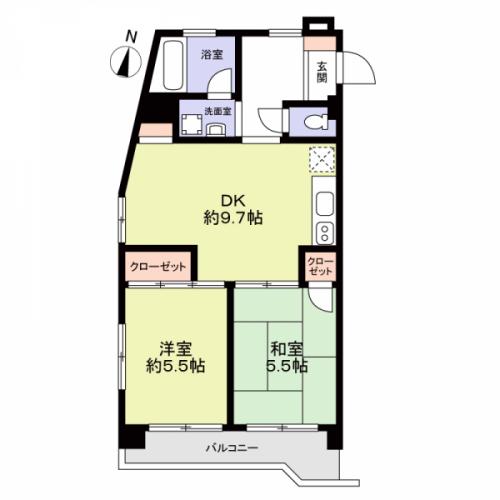 間取り 2DK 専有面積 46.09m2(13.9坪) 壁芯