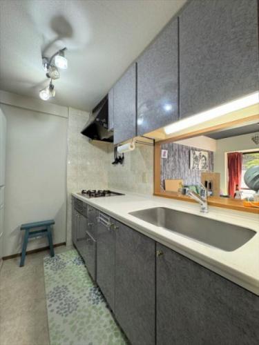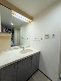 • 一面鏡の洗面台。洗面ボウルが端に寄せられ作業スペースの広さも魅力です。