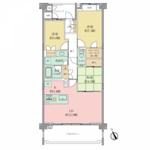 間取り 3LDK 専有面積 76.43m2(23.1坪) 壁芯