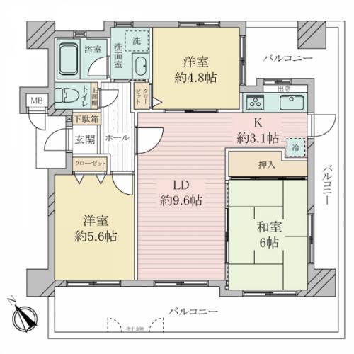 間取り 3LDK 専有面積 62.48m2(18.9坪) 壁芯
