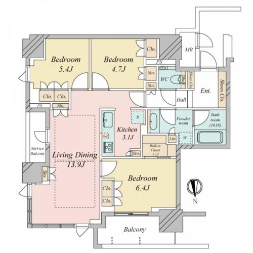 間取り 3LDK 専有面積 81.04m2(24.5坪) 壁芯