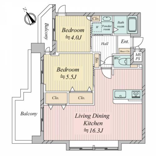 間取り 2LDK 専有面積 59.21m2(17.9坪) 壁芯