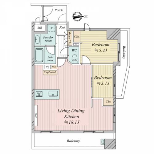 間取り 2LDK 専有面積 56.94m2(17.2坪) 壁芯