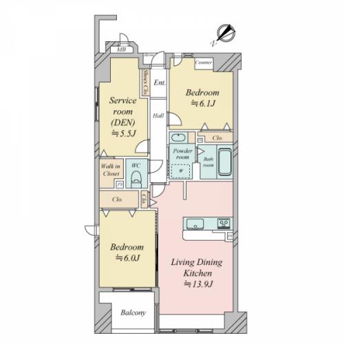 間取り 2SLDK 専有面積 68.51m2(20.7坪) 壁芯